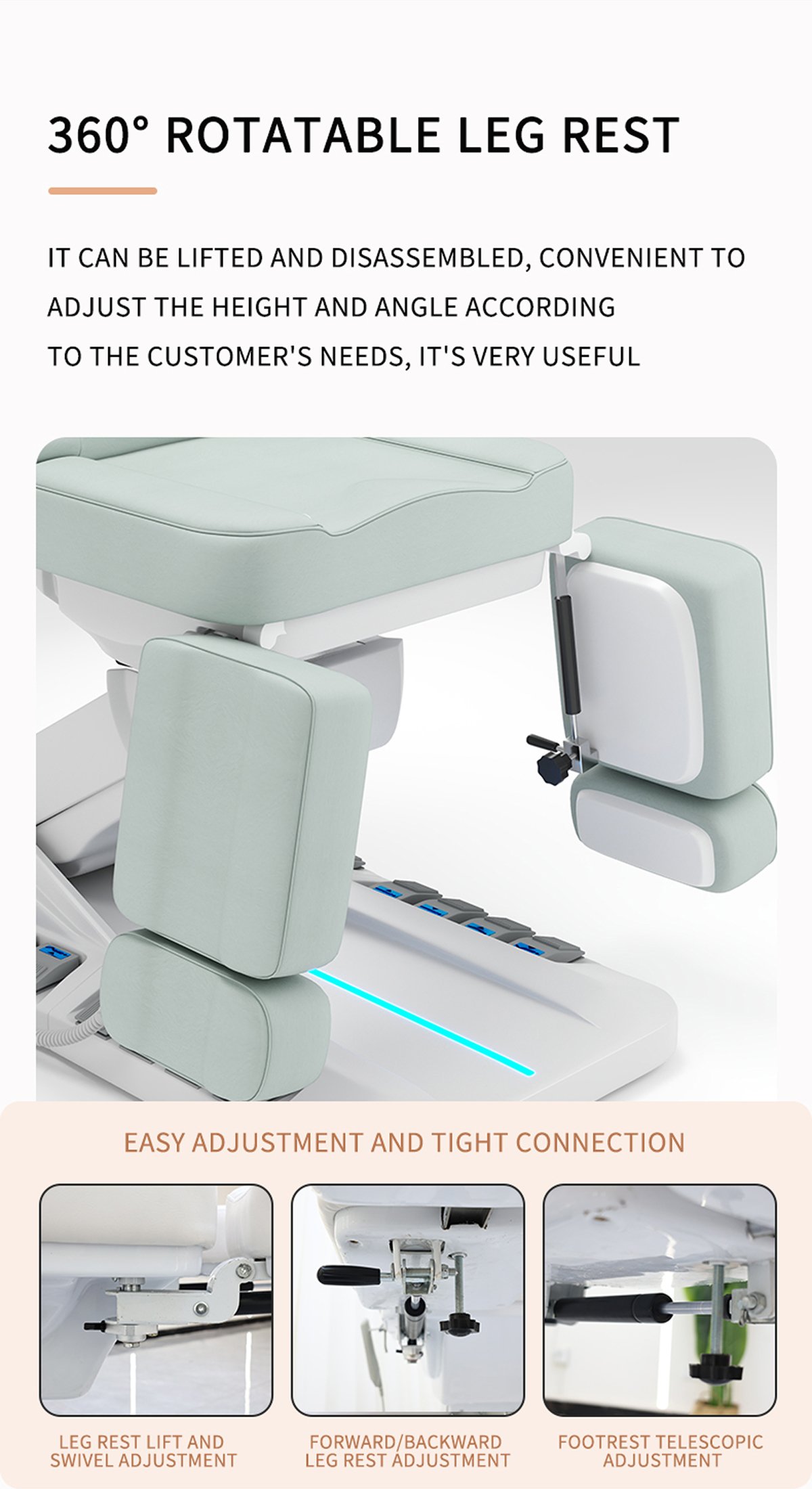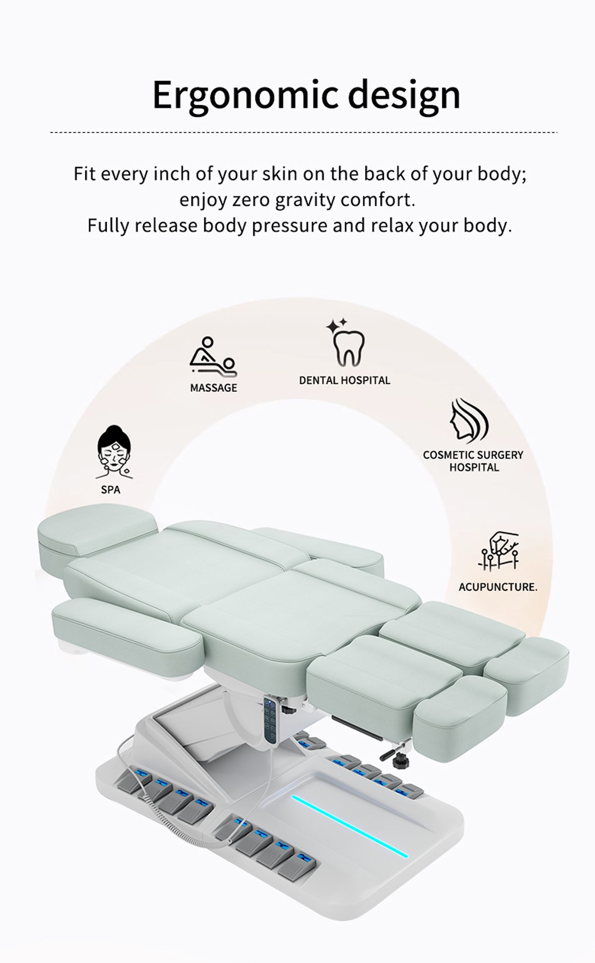 Katil kecantikan berbilang motor boleh digunakan di salun kecantikan, pusat kecantikan, kedai tatu, pusat perubatan, hospital, dsb., dan menyokong warna tersuai