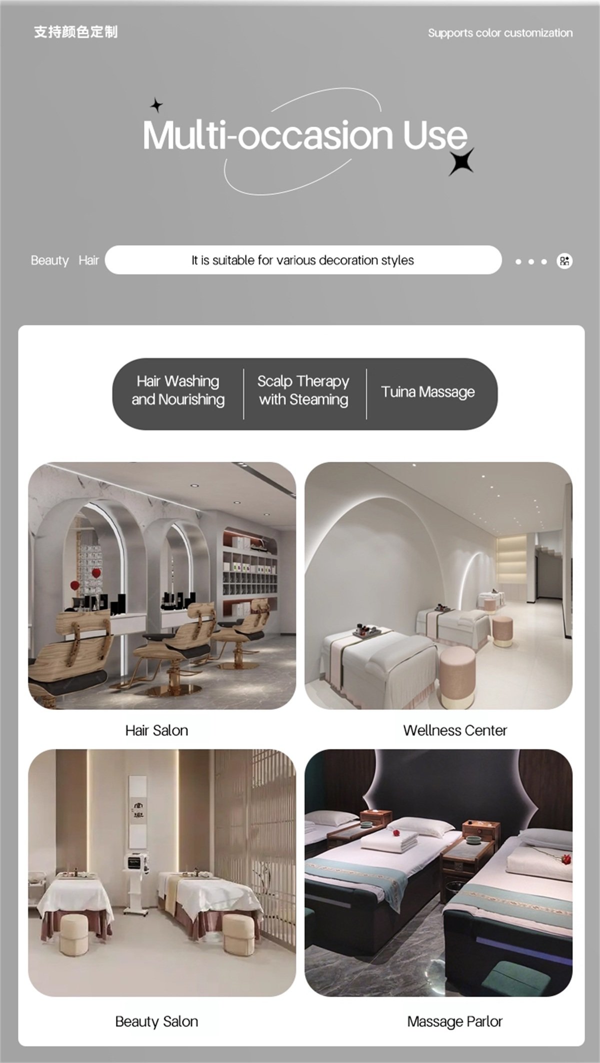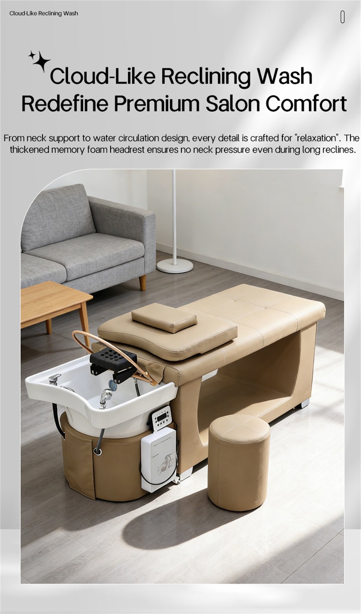 This Large space shampoo bed is suitable for beauty salons, hair salons, nail spas, massage centers, and other establishments. Custom colors are available, and it’s sold directly from the manufacturer.