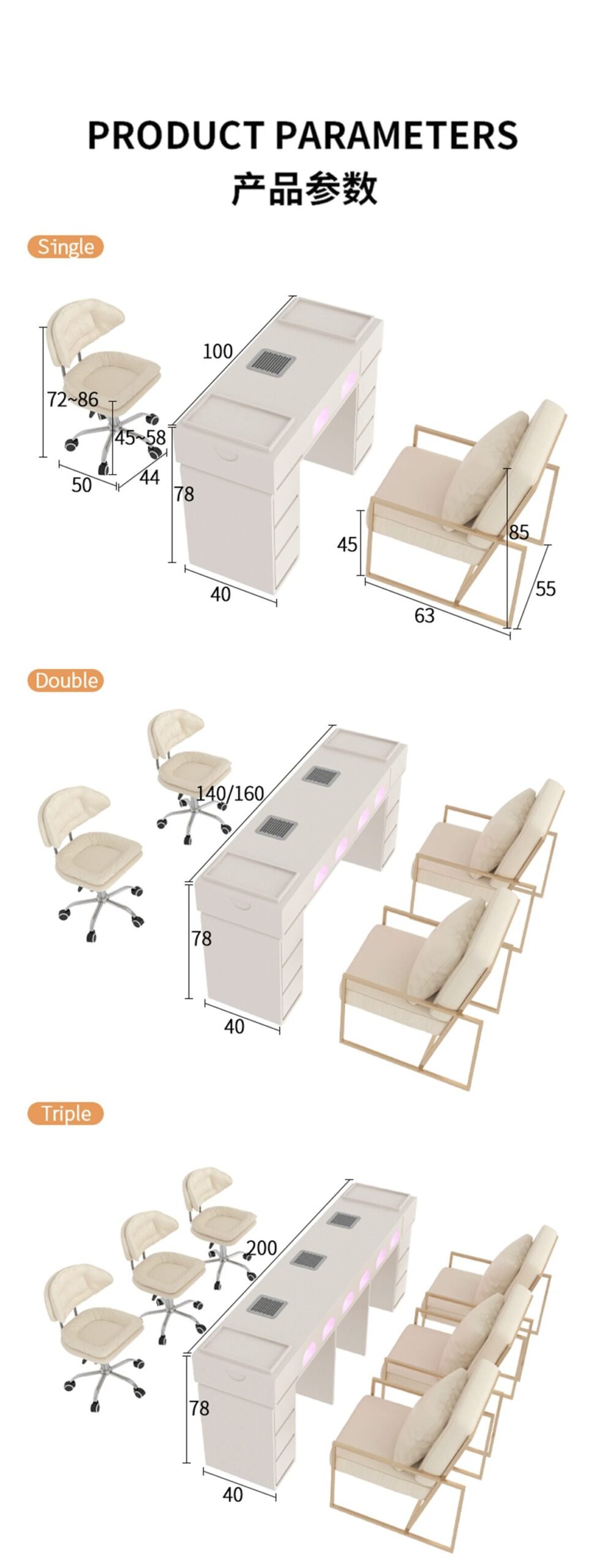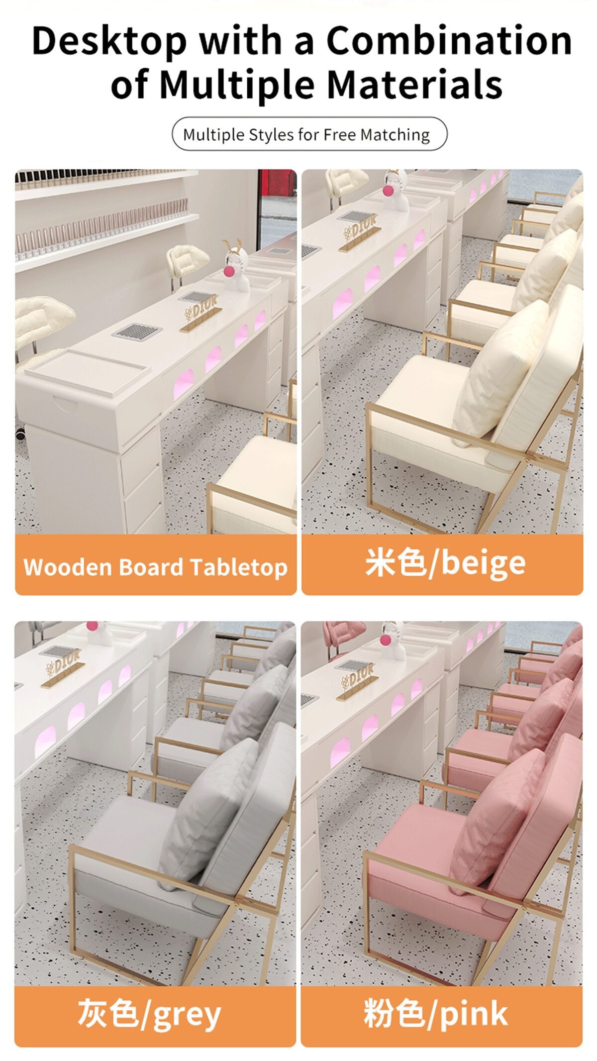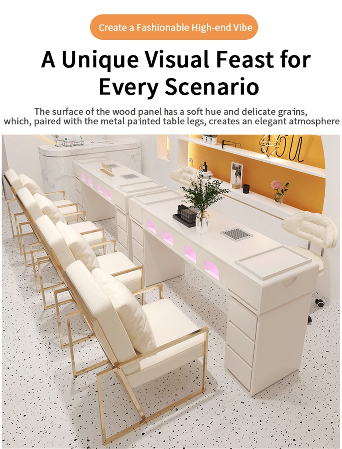 Mesas para unhas projetadas para spas, salões de beleza e centros de estética. Você pode escolher cores e tamanhos personalizados. Fabricante de móveis para salões de beleza, preços de fábrica mesmo para peças avulsas.