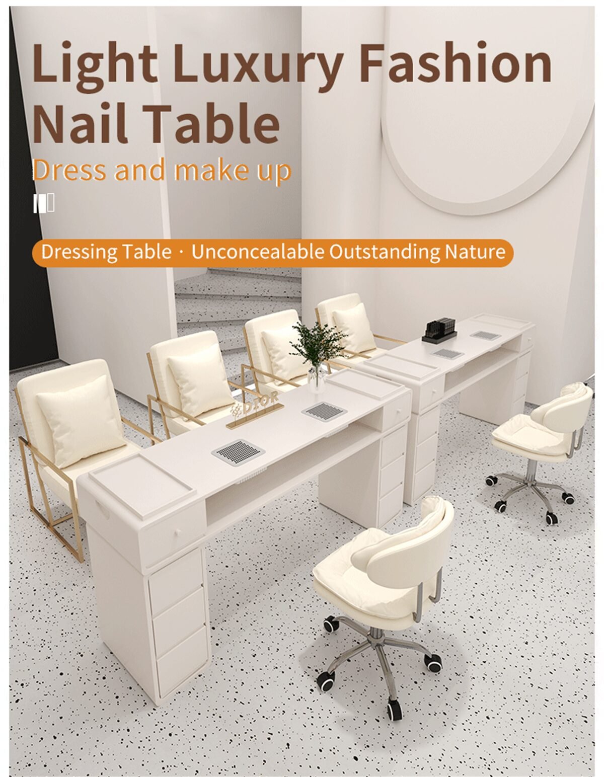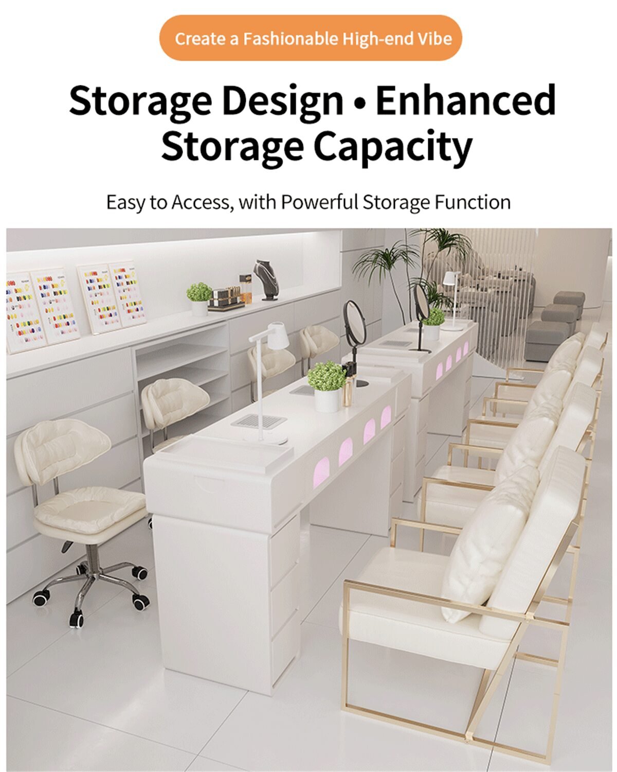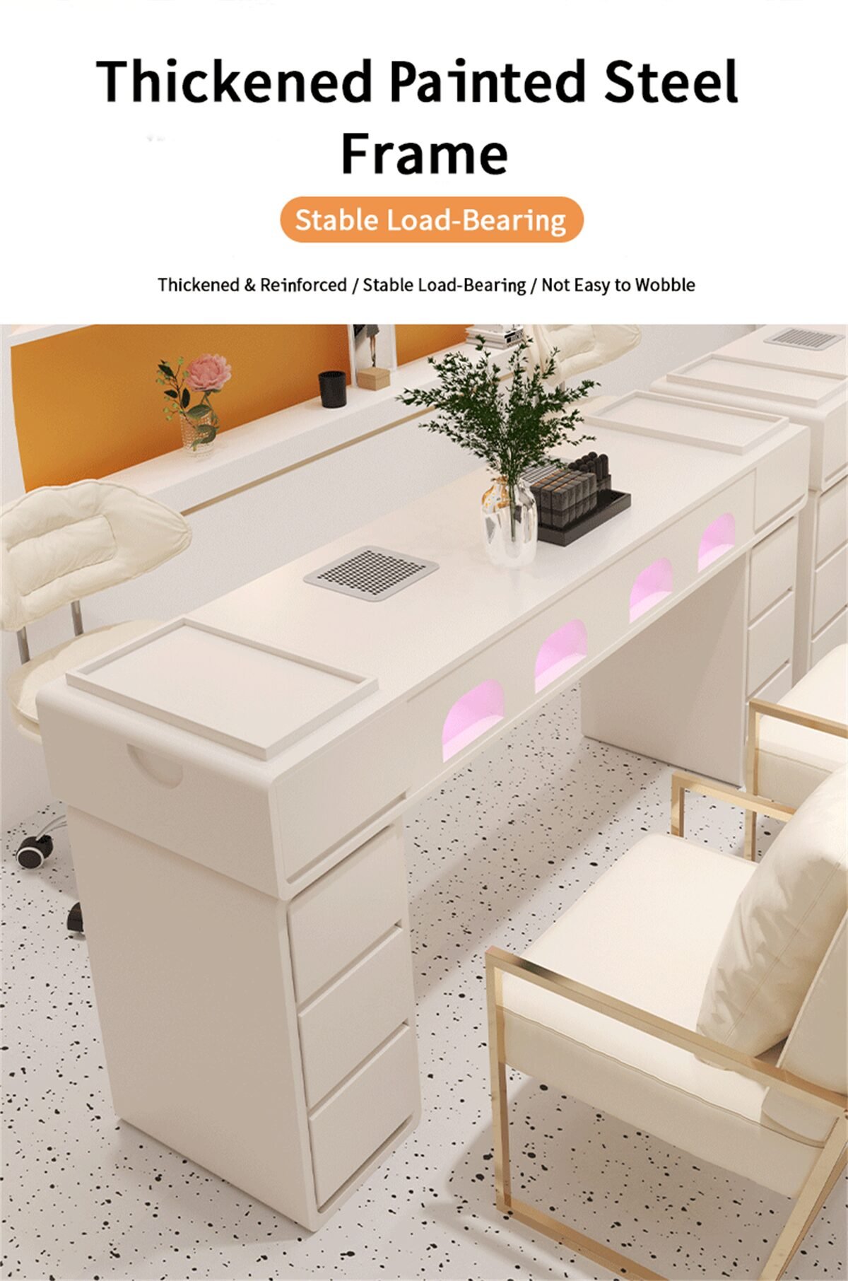 Mesas para unhas projetadas para spas, salões de beleza e centros de estética. Você pode escolher cores e tamanhos personalizados. Fabricante de móveis para salões de beleza, preços de fábrica mesmo para peças avulsas.
